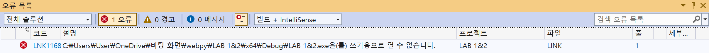 1. 이렇게 코드 LNK1168 오류가 뜨거나,