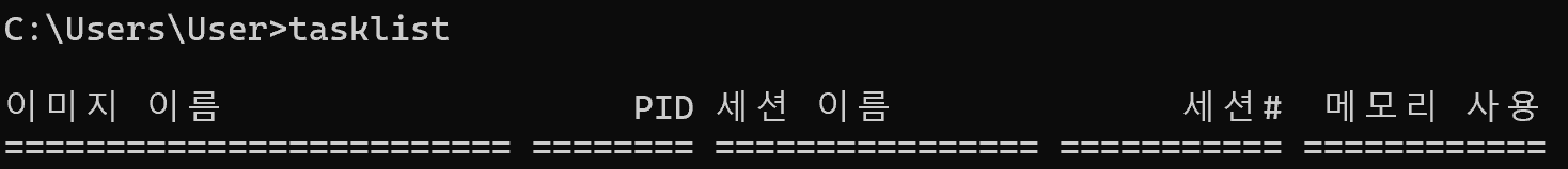 2. tasklist 입력 → 열려있는 exe 파일 찾기