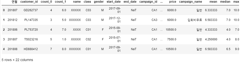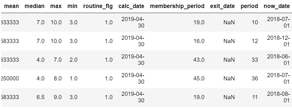 결측치 없는 데이터만 남기고 나머지 제거 → 특정 회원이 그만두기 전월의 상태를 나타내는 데이터