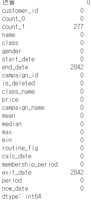 end_date와 exit_date는 탈퇴 고객만 있는 것이므로 유지 회원은 켤측치가 되는 게 당연