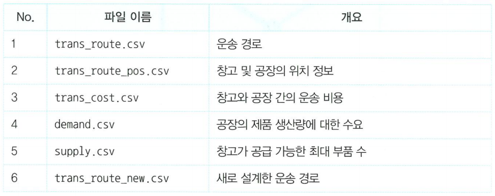 print(str(df_supply.columns[i])+"부터의 운송량:"+str(temp_sum)+" (공급한계:"+str(df_supply.iloc[0][i])+")")